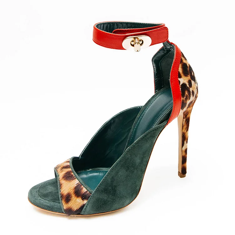 Step into the wild side with our Dark Green Open Toe Leopard Print Ankle Strap Stiletto Heeled Sandals. Effortlessly chic, these sandals elevate any outfit with their fierce style and sophistication.