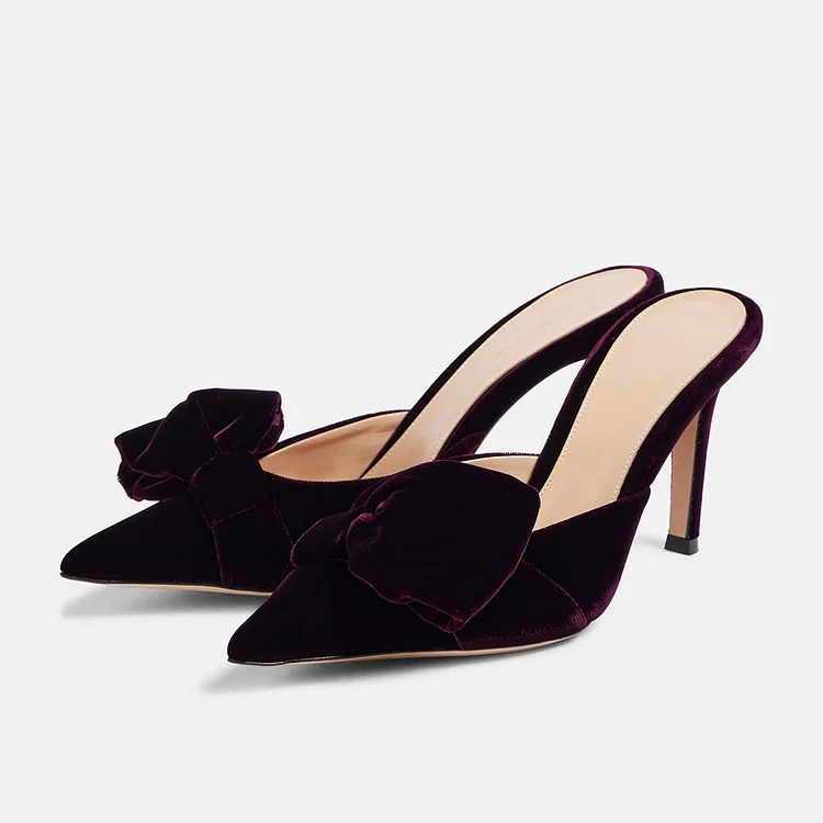 Elevate your style with our Dark Purple Velvet Bow Accent Pointed Toe Slip-On Mule Heels. Luxurious velvet, a chic bow detail, and a comfortable slip-on design make these shoes a standout choice.