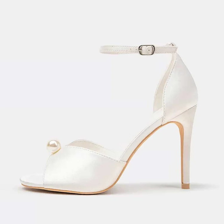 Step into sophistication with these satin peep toe pearl embellished heeled sandals in white. These sandals elevate your style effortlessly with a delicate ankle strap and elegant pearls.