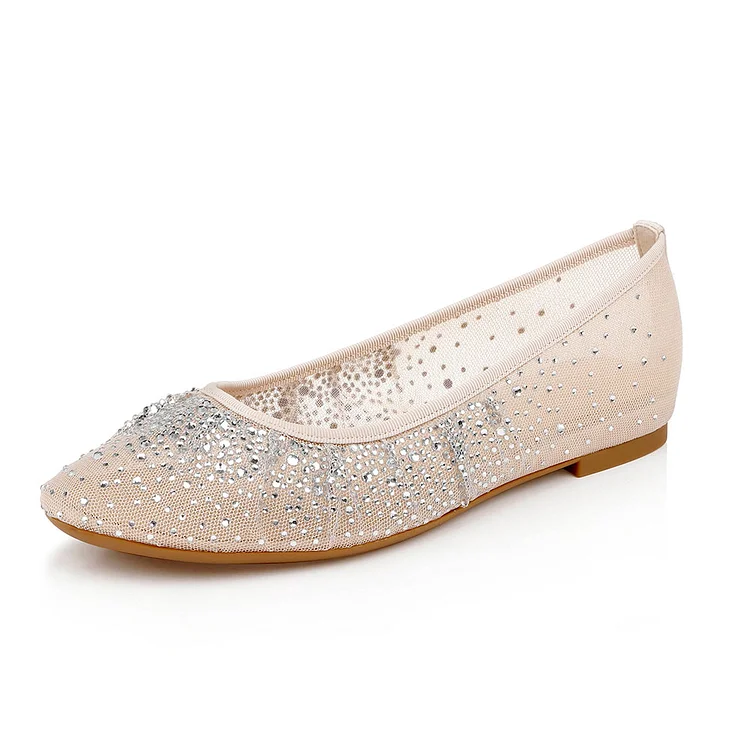 Step into elegance with our Beige Mesh Round-Toe Rhinestone Flats. Luxurious and versatile, these shoes dazzle with all-over rhinestone embellishments, adding glamour to any outfit effortlessly.