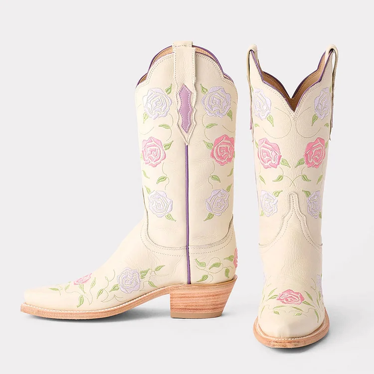 Step into the wild west with our Beige Snip Toe Rose Embroidered Mid Calf Western Boots for Women. The intricate rose design adds a touch of femininity to a rugged style.