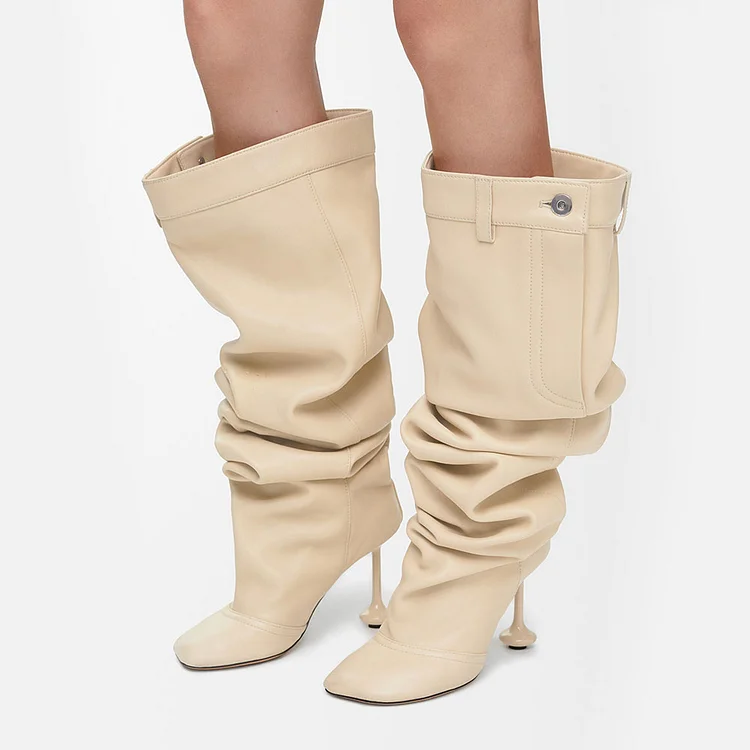 Elevate your style with our Beige Closed-Toe Sculptural Heel Trouser Slouchy Over The Knee Boots. Crafted for comfort and fashion-forward appeal, these boots are a versatile statement piece for any wardrobe.