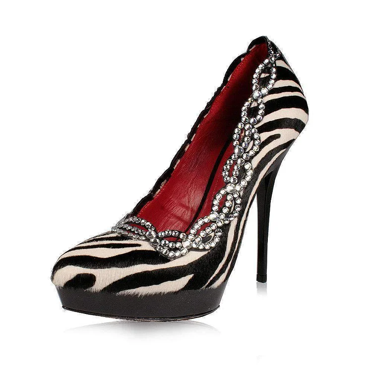 Elevate your fashion game with these Black and White Zebra Rhinestone Almond Toe Stiletto Heels Pumps. Featuring a captivating zebra pattern and sparkling rhinestone embellishments, these pumps offer both style and sophistication. The almond toe design ensures comfort, while the stiletto heel adds height and elegance. Perfect for formal events or a night out, these versatile heels will make a bold statement wherever you go.