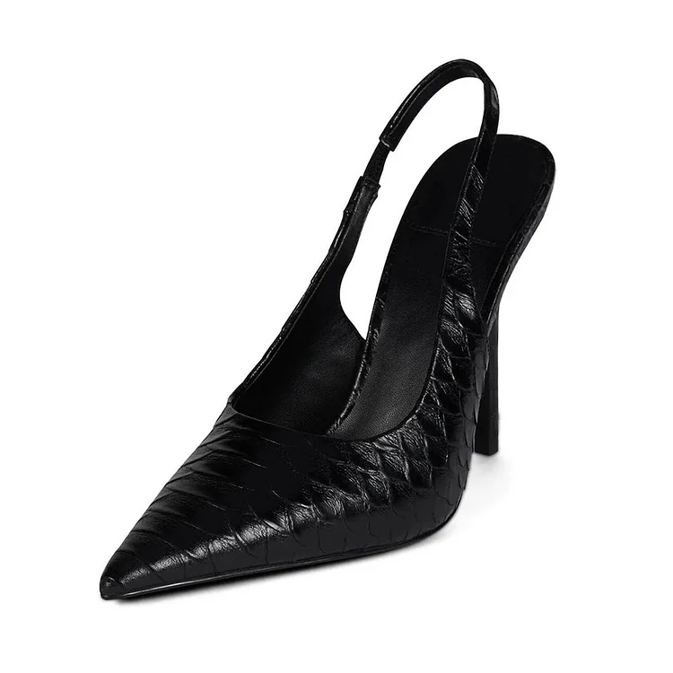 Elevate your style with our Black Python Embossed Slingback Pumps. Featuring a sleek pointed toe and stiletto heel, these shoes exude sophistication and edge for any occasion.