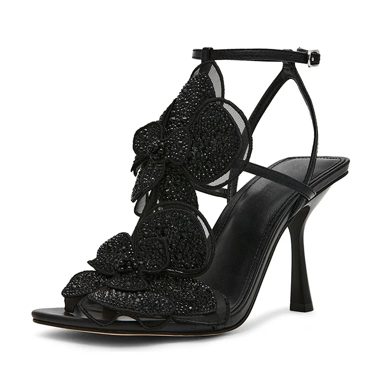 Elevate your style with these Black Rhinestone Flower Strappy High Heel Sandals. Featuring an open square toe and dazzling rhinestone flower embellishments, perfect for adding glamour to any outfit.