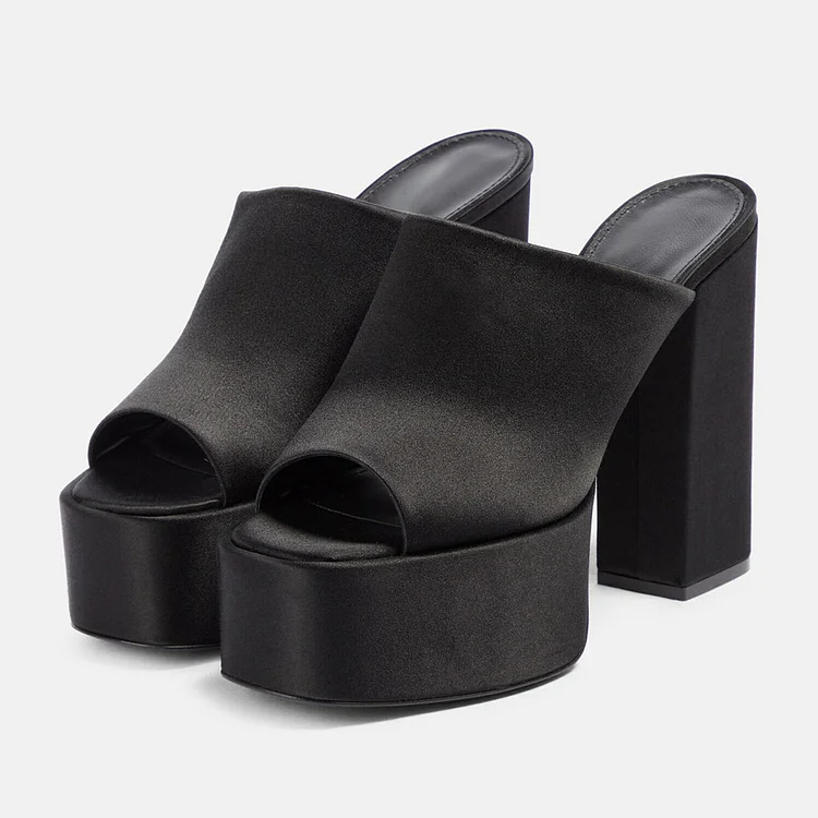 Elevate your style with our Black Satin Open Square Toe Block Heel Platform Slide Sandals. Chic and versatile, these sandals offer comfort and sophistication for any occasion.