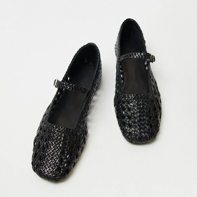 Step out in style with these black square-toe flat shoes for women. Featuring woven detailing and a chic buckle strap, they blend comfort with sophistication effortlessly for any occasion.