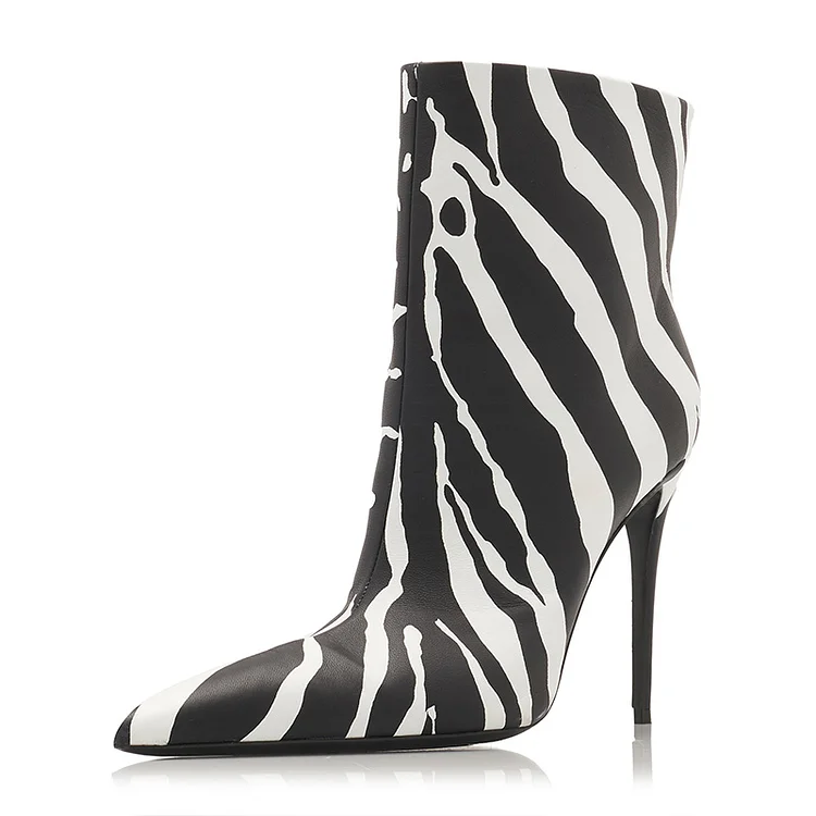 Step out in style with these Black & White Stilettos Zebra Boot Pointed Toe Heeled Ankle Boots. Their sleek design and striking pattern will add a fierce touch to any outfit.