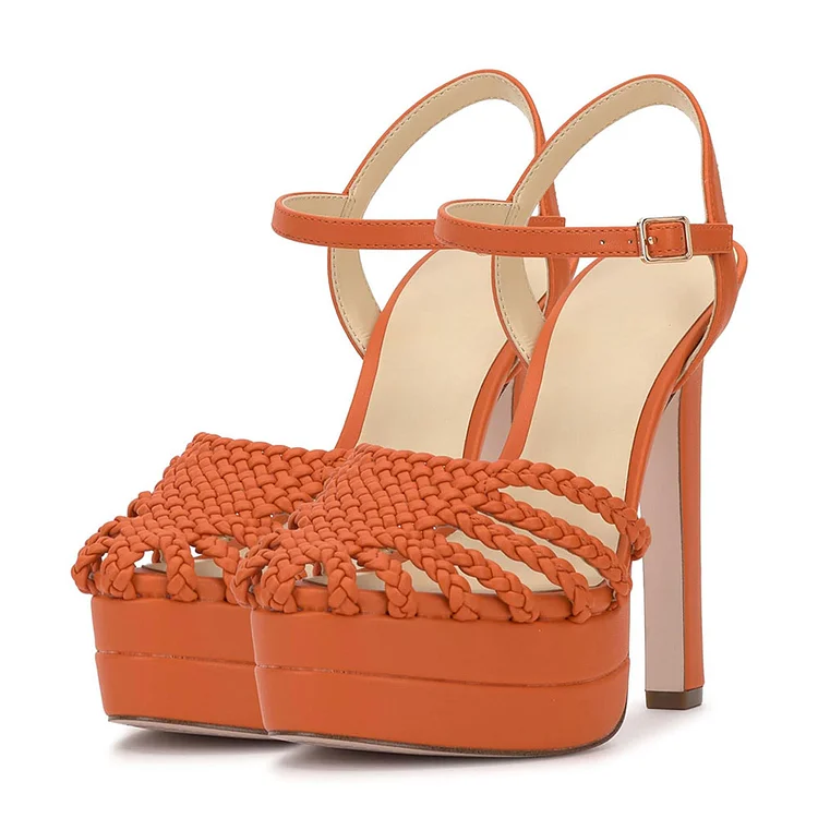 Elevate your style with these Orange Braided Round Toe Ankle Strap Platform Sandals for Women. The vibrant hue, intricate braided detail, and platform design effortlessly blend fashion and comfort.