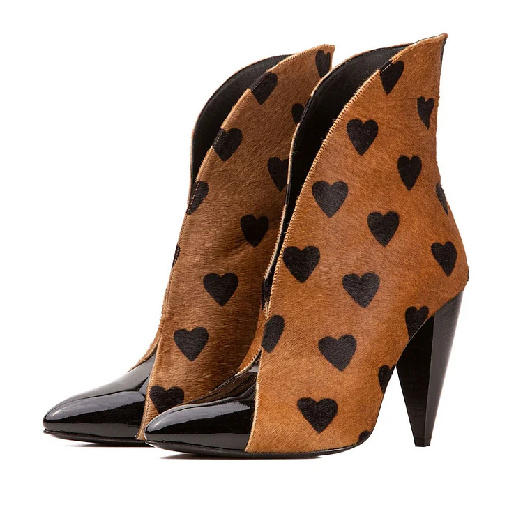 Elevate your style with these chic Brown and Black Heart Print Cone Heel V-Cut Short Boots. Featuring a unique heart print design, V-cut silhouette, and comfortable cone heel for fashionable flair.