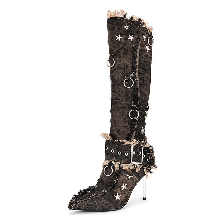 Step out in style with our Brown Denim Star Studded Stiletto Heel Ring Adorn Tall Boots. Elevate any outfit with these edgy and chic boots that blend fashion and flair effortlessly.