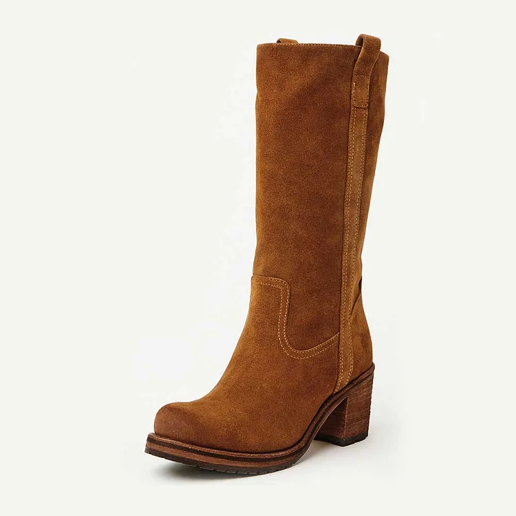 Step into sophistication with these Brown Vegan Suede Mid Calf Boots. Featuring a round toe and stacked heel, these classic boots offer style and comfort for any occasion.