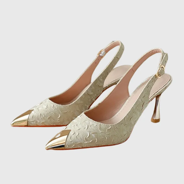Elevate your ensemble with our Champagne Satin Slingback Heels. Featuring a chic metal cap toe and embossed detailing, these elegant heels effortlessly blend sophistication with style for any occasion.