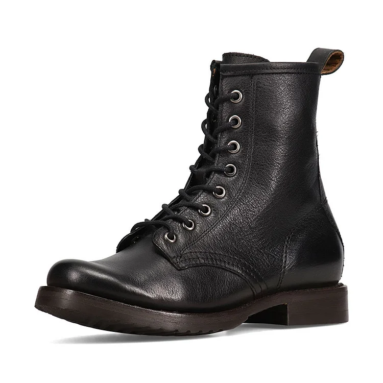 Elevate your style with these timeless black booties. Featuring a lace-up design and combat boot silhouette, these round-toe flats offer comfort and versatility for the modern woman's wardrobe.