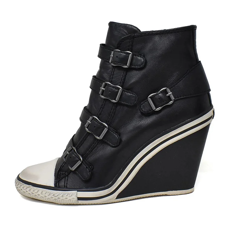 Custom Made Black Round Toe Multi Buckle Sneaker Wedge Boots