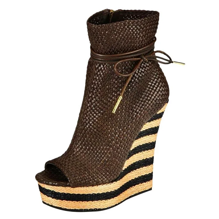 Custom Made Brown Woven Peep-Toe Strappy Wedge Platform Booties