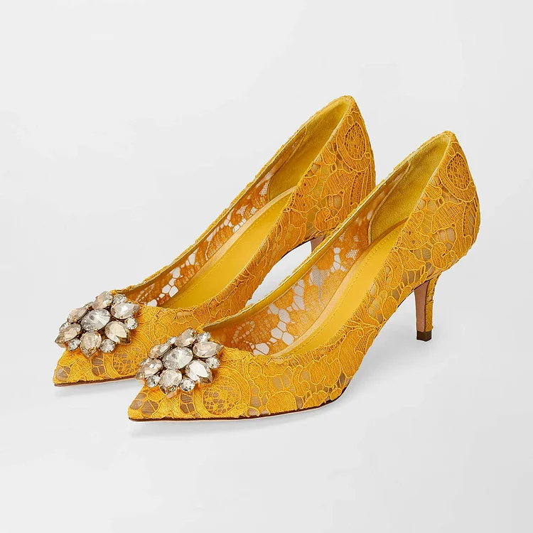 Custom Made Yellow Lace Crystal Embellished Mid Heel Pumps Shoes
