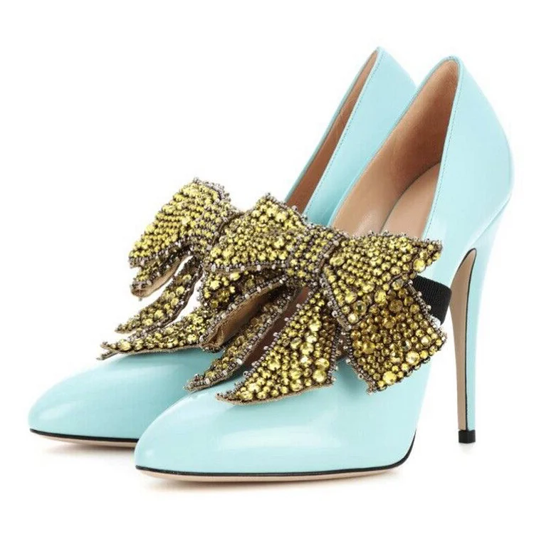 Elevate your style with these striking Cyan Patent Pointed Toe Stiletto Heels adorned with dazzling rhinestones and a charming bow detail. Perfect for parties, these pumps exude elegance and glamour.