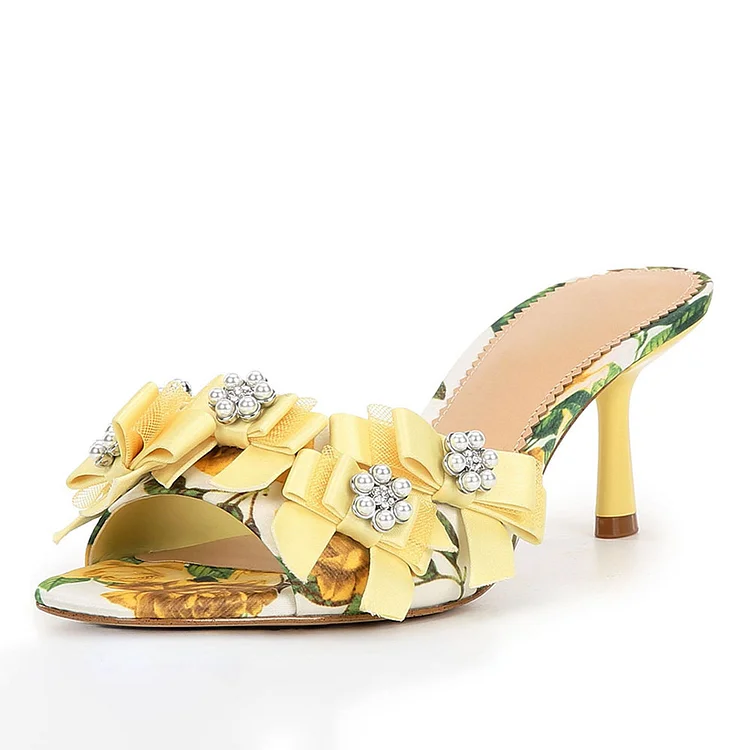 Step into summer with elegance in FSJ's Yellow Flower Print Open Toe Pearl Decor Bow Mules Sandals. Perfect for adding a touch of charm to any outfit.