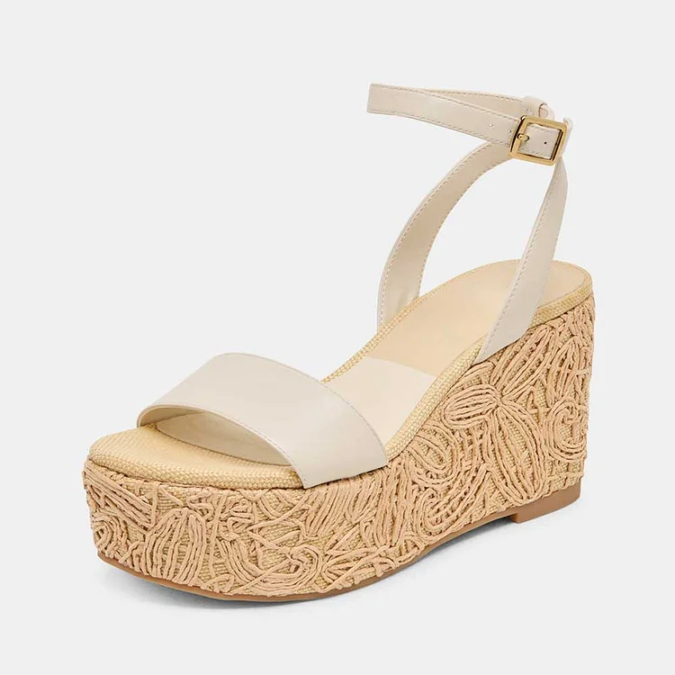 Step out in style with these ivory open-toe platform wedge sandals featuring a textured twist design and ankle strap. Elevate your look with comfort and flair in every step.