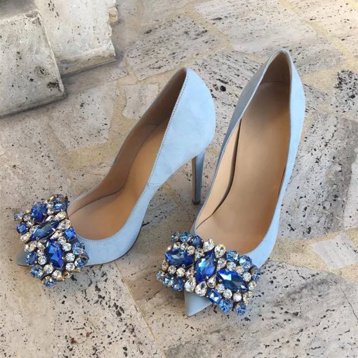 Step into elegance with our Light Blue Vegan Suede Stiletto Heels. Adorned with dazzling rhinestones, these pumps add a touch of glamour to any outfit. Ethically crafted from vegan suede, these heels are both stylish and cruelty-free.