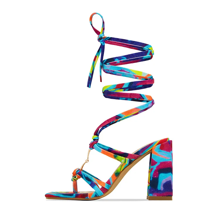 Step out in style with these multicolor lace-up heels featuring open square toes and gold hardware accents. Elevate your look with a touch of elegance and a splash of vibrant hues.