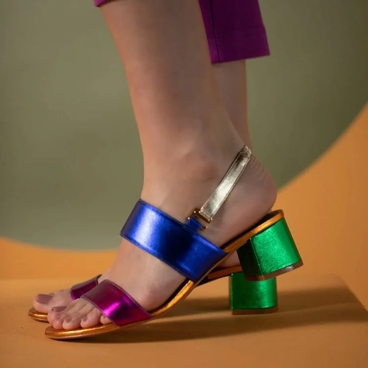 Multicolor Metallic Block Heel Sandals Open Toe Slingback Shoes