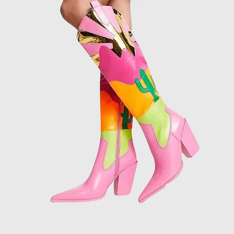 Step into style with these vibrant Multicolor Patchwork Pointed Toe Cactus Zipper Cowboy Boots for Women. Featuring a unique design, pointed toe, cactus zipper detail, and a comfortable fit for everyday wear.