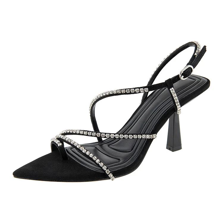 Step into sophistication with these Open-Toe Rhinestone Embellished Strap Slingback Black Heels Sandals. The perfect blend of elegance and glamour elevates your style effortlessly in every stride you take.