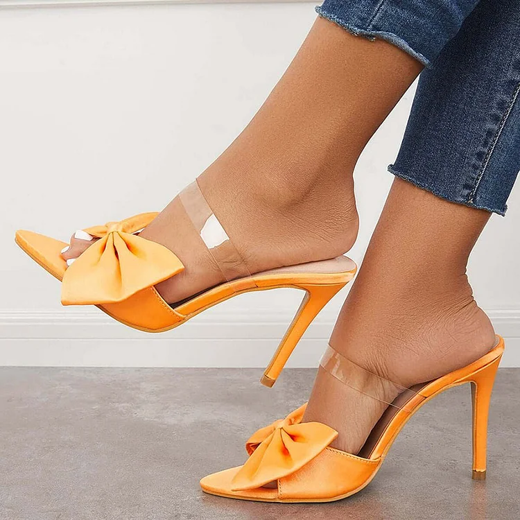 Orange Satin Oversized Bow Heels Clear Strap Slip On Mules Shoes