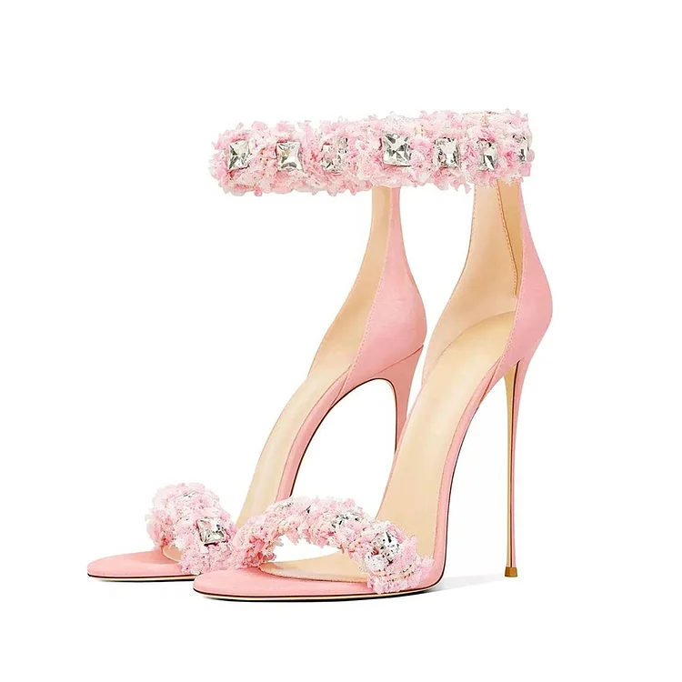 Elevate your style with these stunning Pink Heel Sandals. Featuring an open round toe, rhinestone embellishments, and a convenient back zipper closure, perfect for adding glam to any outfit.