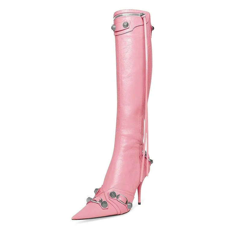 Step out in style with our Pink Stiletto Heel Zipper Pointed Toe Tall Boots. Featuring edgy studs, a sleek silhouette, and a bold hue, these boots are the perfect statement piece.