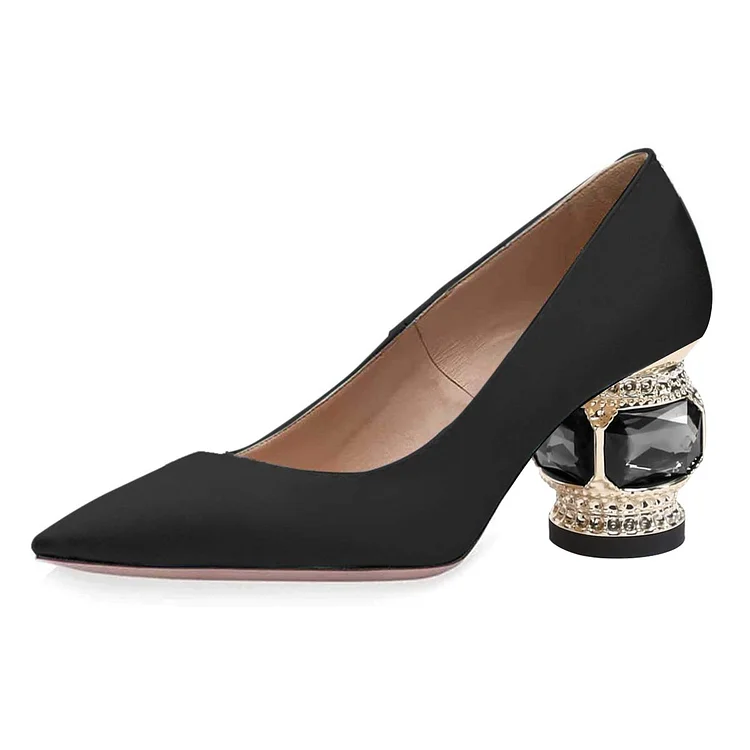Step into elegance with our Pointed Toe Pumps. Crafted from luxurious satin and adorned with radiant rhinestones, these black heels add a touch of glamour to any ensemble.