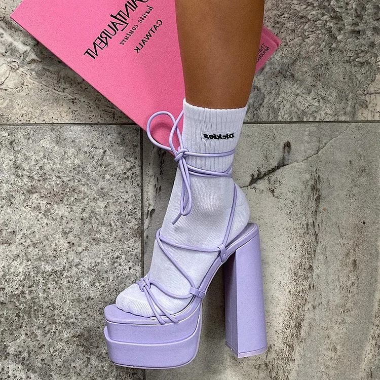 Featuring a modern square toe and multiple strappy details, these sandals offer a bold, fashion-forward look. The chunky heel and platform provide both height and stability, making them comfortable enough for all-day wear. In a striking purple hue, they're perfect for parties and nights out.