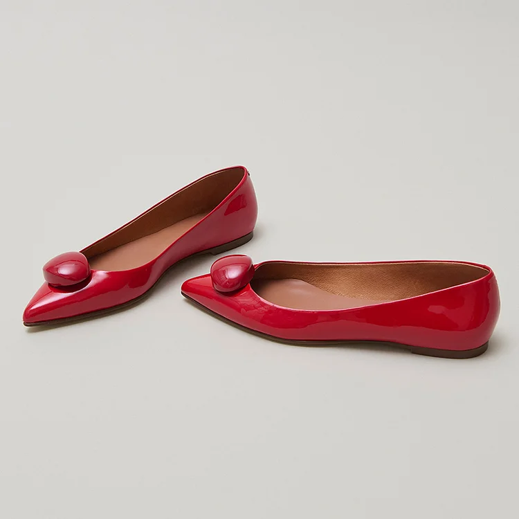Stride in style with these vibrant Red Patent Leather Flat Shoes for Women. Featuring a chic hemisphere decoration and pointed toe design, elevate your look with flair and comfort.