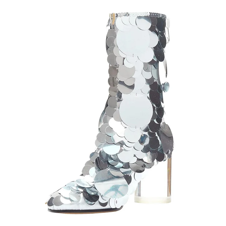 Shine in style with our Silver Sequin Round Toe Cylinder Heel Back Zipper Short Booties. These glamorous boots blend sophistication with sparkle, perfect for any chic ensemble.