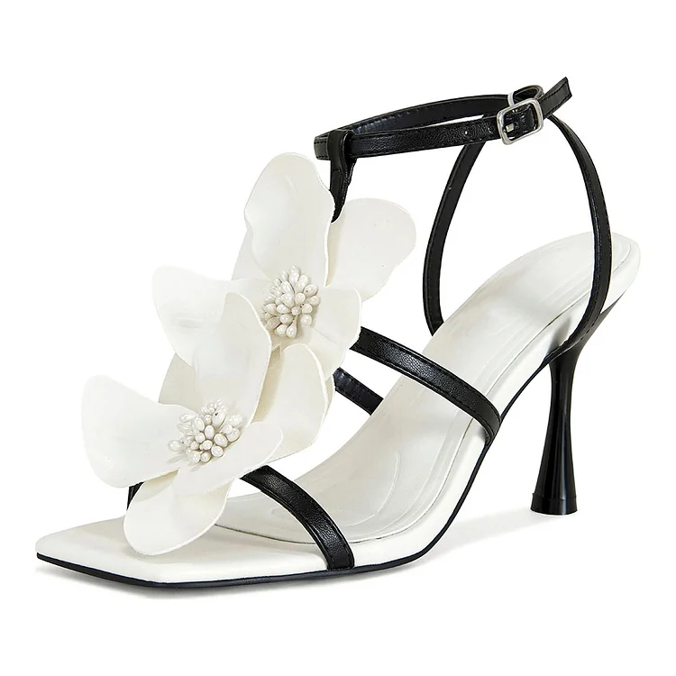 Step into elegance with these sophisticated white and black high heel sandals. Featuring an open toe design, intricate flower T-strap detail, and a stylish silhouette for a chic look.