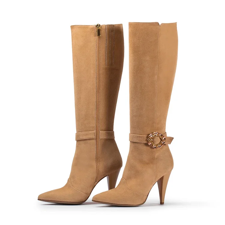 Elevate your style with these Tan Pointed Toe Rhinestone Decor Buckle High Heel Boots. Featuring a dazzling rhinestone buckle, pointed toe design, and convenient zipper closure for a touch of glamour.