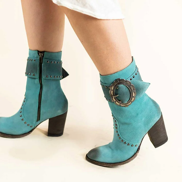 Step out in style with our Turquoise Distressed Buckle Strap Chunky Heel Studded Mid Calf Boots. Featuring a trendy distressed finish, bold buckle strap, and edgy studs for a fashion-forward look.