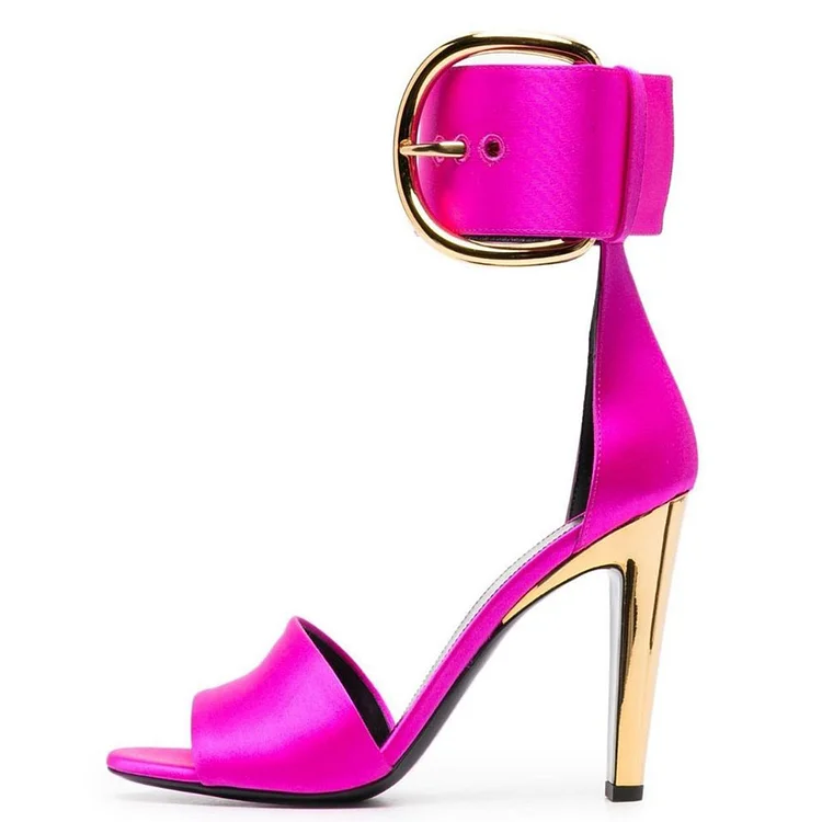 Turn heads with bold, glamorous flair in our Fuchsia Satin Sandals, featuring an oversized buckled ankle strap and chunky metallic heels. The luxurious satin finish and statement hardware bring modern elegance and runway-ready edge to these striking heels—perfect for parties, special events, or making every step unforgettable.